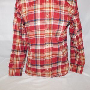 This Eddie Bauer Mens Small Relaxed Fit Red Blue Cream Plaid Long Sleeve Button Front Flannel Shirt is in Excellent clean condition. Shirt is 100% Cotton - Machine washable.