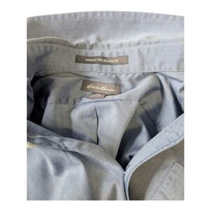 Classic Eddie Bauer men's blue button-up shirt with long sleeves. Features a front pocket and buttoned cuffs.