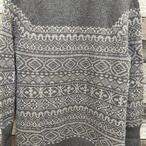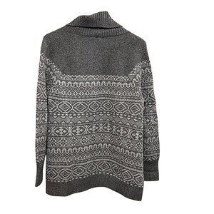 Eddie Bauer gray Nordic pattern cardigan. Ribbed shawl like neckline down the open front.