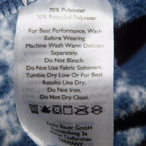 This Womens PL ( Petite Large ) Eddie Bauer Quest 1/4 Zip Pullover Fleece in Blue White Print is in Great clean condition. Fleece is 100% Polyester - Machine washable. This 1/4-zip makes staying cozy and warm easy with its anti-pilling finish for durability, standup mock neck for extra warmth, and zip placket for quick venting. Raglan sleeves provide unrestricted mobility.