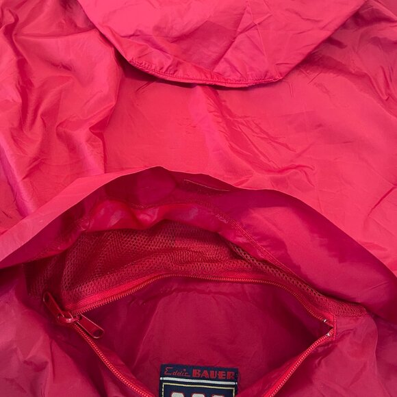 This is an Eddie Bauer windbreaker/rain jacket in durable nylon. Although label says Mens XS, the vibrant red and neutral style make it suitable for both gender. Measures 26" back center length, 19.5" shoulder width, 23" sleeve length, 22.5" underarm to underarm. 2 front slid pockets; Hood with adjustable cord; Relaxed generous fit; Back-center zipper pocket serves to hold the jacket in a neat small pack. Ideal for travelling, hiking, and outdoor ventures.