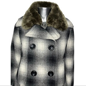 Beautiful wool coat from Eddie Bauer. Plaid peacoat with removable faux fur collar. Double breasted, front pockets.
