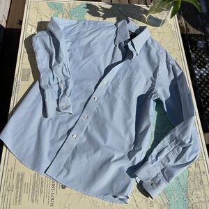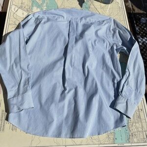 Eddie Bauer Pinstripe Relaxed Fit Wrinkle Resistant Button Up Shirt. 100% cotton, tagged as a size medium. Measures 18" across shoulders, 21.5" pit to pit, 28" long.