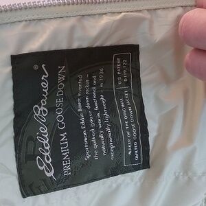 Eddie Bauer Quilted Goose Down Filled Jacket. Mint Green Size Large. Adjustable waist tabs at back. Front Pockets. Inside Pockets. Excellent condition.