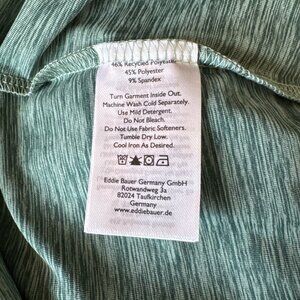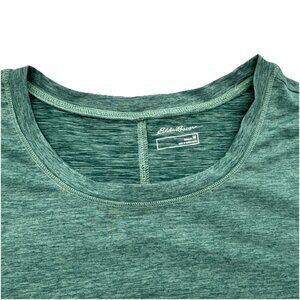 Discover Eddie Bauer's pre-owned women's medium short sleeve crew neck workout shirt in a refreshing green hue, featuring advanced wicking technology that keeps you comfortable and dry. Perfect for the active woman who loves to explore nature, hike, or simply enjoy a brisk walk in the park.