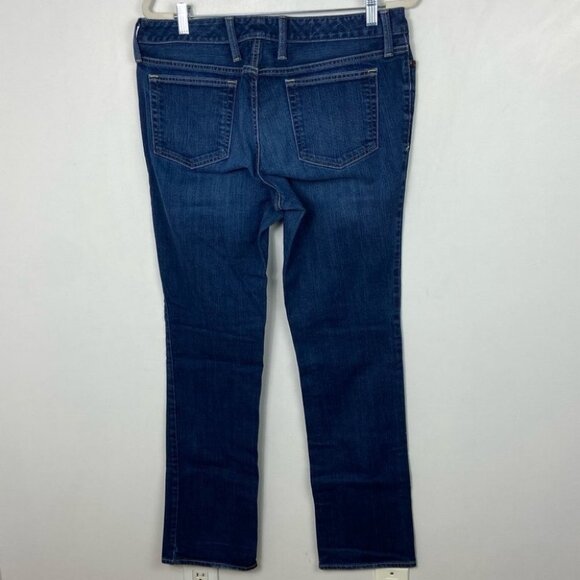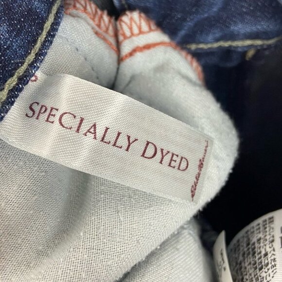 Eddie Bauer Modern Slim Straight Leg Jeans in Dark Blue and Women's Size 14 Long. 98% cotton and 2% spandex. Machine washable. 16.5" leg opening. Very good pre-loved condition. No visible flaws.
