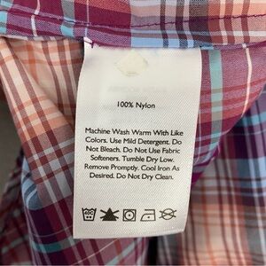 Eddie Bauer Shirt. Women's tag size large. 100% Nylon. Purple and peach plaid. Sleeveless. Button up. Chest pockets with button down flaps.