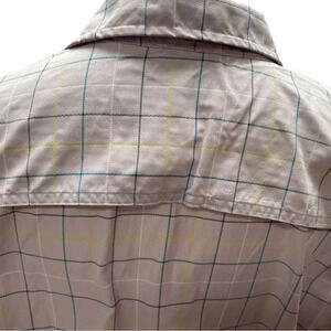 Eddie Bauer long sleeve collared shirt with a vented back. It’s a size XL. Travex style and a classic fit. Buttons all the way up. Quite athletic looking. A pretty purple plaid design and colour. Has 2 front buttoned pockets. Looks NWOT as the size sticker is still attached.