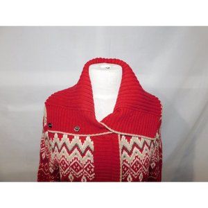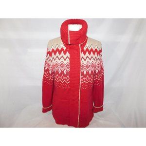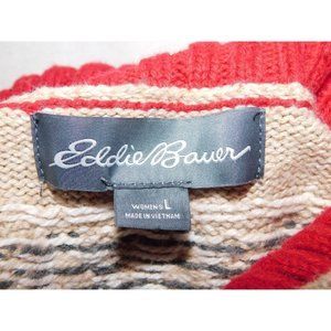 Eddie Bauer Women L Red Tan Fair Isle Full Zip Cardigan Sweater Convertible neck