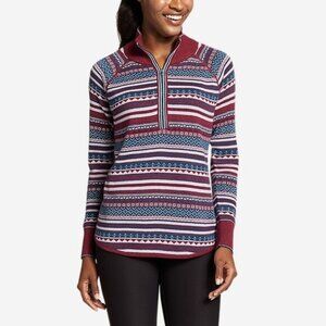 Beautiful Nordic printed quarter-zip sweater in cream and black from Eddie Bauer; features red accents throughout for a pop of colour; ribbed at cuffs and collar; loose/open fit curved hem for a more relaxed fit; poly/rayon blend; great as a base layer for winter sports or for lounging at home