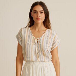Eddie Bauer Womens Size XL Striped Tie Front V Neck Short Sleeve Pullover Blouse