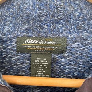 Eddie Bauer, blue, marled blue, heathered knit, mixed tones, wool blend, collared cardigan, button-up sweater, front closure, long sleeve, elbow patches, faux suede patches, cozy texture, medium to heavy weight, soft wool blend, classic fit, vintage outdoorsy, cabin cozy, smart layering piece, grandpa-core, scholarly style, cool outdoorsman, stylish hiker, rustic charm, cold-weather essential, laid-back academic, timeless knit, heritage-inspired, mountain weekend wear, fall and winter staple, flannel lover energy, trail-to-town style, comfy but put-together, classic layering, practical fashion, refined casual, cozy minimalist, forest cabin vibes, quiet style confidence, Pacific Northwest aesthetic, vintage prep, timeless outdoorsman, off-duty professor.