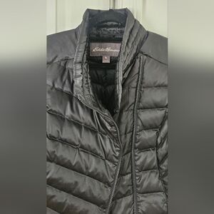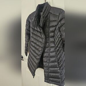 Chic and cozy black puffer coat. Ideal for cold weather. Features a stylish quilted design. asymmetrical zipper, zipper pockets, has some light makeup on inside collar otherwise almost like new , worn handful of times
