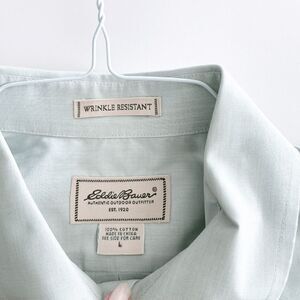 Want to look sharp without sacrificing comfort? Eddie Bauer Men's Collared Shirt is perfect for you! Made with wrinkle-resistant material, this short-sleeved button-down is the ideal choice for those who want to look good while on the go. In a refreshing mint green color and a size large, it's bound to be your new favorite in your wardrobe.