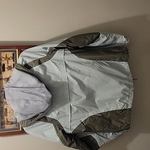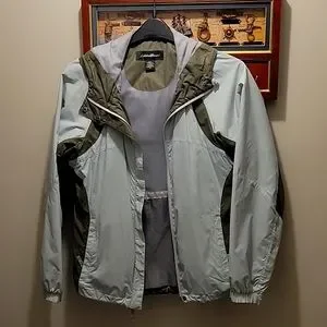 Edie Bauer Spring jacket with attached hood. Zipper front, side pockets. Great condition. Velcro cuffs.
