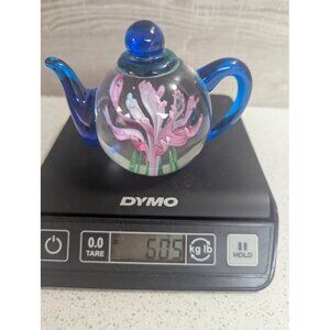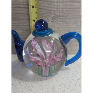Stunning glass teapot with a blue handle, spout and top featuring a beautiful pink and green flower inside.