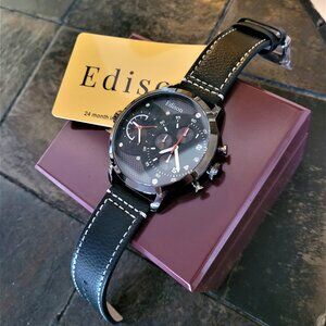 Edison Men's Oversized Dual Time Zone Black Leather Watch