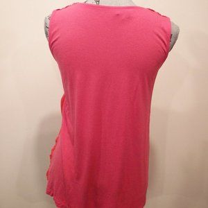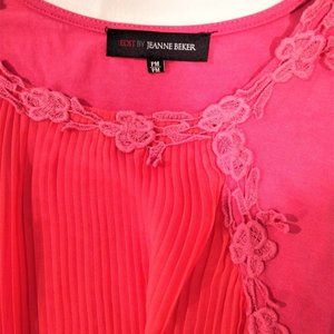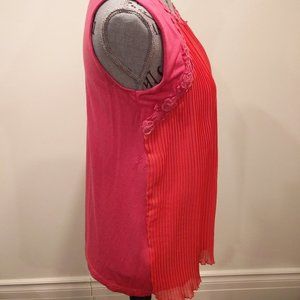 Coral sleeveless layered blouse. Pleated crepe front layer. Lace crocheted detailing on the shoulders. Excellent pre-owned condition.