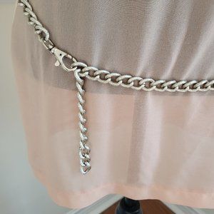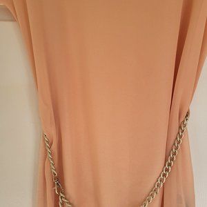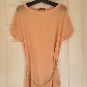 Edit by Jeanne Beker tunic in light peach, size S. The front is transparent and the back is 100% cotton (tee-shirt material). Comes with the silver belt, adjustable. Excellent condition.