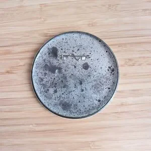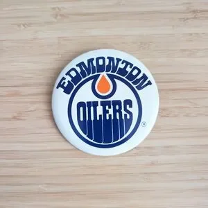 Round button pin featuring the Edmonton Oilers logo. larger size, represent the Oilers in Game five!!!