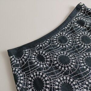 A mini skirt in a black shade with embroidered white circles and web stitched patterns. Made from a linen blend and fully lined. It’s an A-line design that falls above the knee length. Perfect for spring and summer. Very good condition.