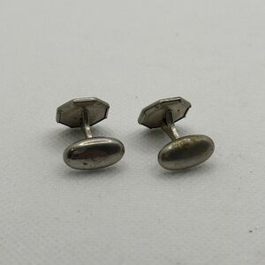 These Edwardian silver plated cufflinks are very vintage chic. There is a swivel back that still functions on both and the perfect amount of patina. The octagonal shape with black enamel and a rhinestone, makes this a rare and unique find. The face is approximately 1/2" in diameter. These cuff links are in very good preloved condition.