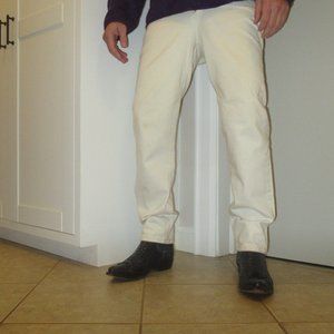 Made in Canada, classic 5-pocket, Edwin white jeans in excellent used condition. They are labelled a 32 waist but the actual waist measurement is 31. The inseam is 30". They have a tapered cuff measuring 7" across, a rise of 10.5", a knee width of 8" and thigh of 10".