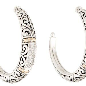 From the Balissima Collection. Intricately-carved sterling silver hoops with18k yellow gold and a flicker of pavé white diamonds.
