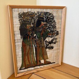 Framed under glass, hand painted papyrus painting of Egyptian royals at the Tree of Life. Natural wooden frame is 12" x 15". Artwork size is approx. 9 3/4" x 12 3/4". Pre-owned condition: wood frame has a few scratches/indents to surface, natural papyrus paper has folds/ripples underneath the glass, see photos.