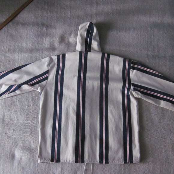 I got this as a gift from someone coming back from Egypt... no sticker, identification or size mentionned, but it seems pretty big... the fabric is stiff like canvas... buttons are made of wood and one of them is missing (it was like that when i got it)... there are also a few light stains (see picture) but I believe this was also there when I got it since I barely use it... it' WAY too big for me...