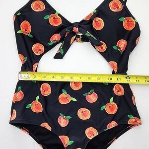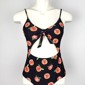Excellent pre-owned condition, Eidon SGS Sports one piece cut out bathing suit with fun all over peach print on black and padded cups, size Small.