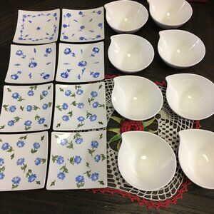 Very good preowned vintage condition, white porcelain/bone appetizer plates and spoons. Eight of each hand painted/peint a la main in blues and greens. It's an interesting set as they are not all perfectly matching and entirely unique. Squares and comma-shaped. Beautiful and signed by the artist.