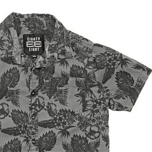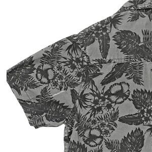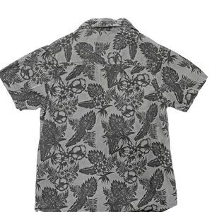 This shirt is RAD! Dark grey with black tropical print, nice structured 100% cotton, and a front pocket. Little tear on the back sleeve which has been lovingly repaired and is hardly noticeable. Get this in your bundle and on your styled guy for summer!