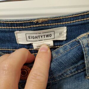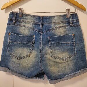 Eighty two denim brand jean shorts from Ardene. Leg cuffs are not sewn to denim, so you can have them rolled or unrolled. Size 7. Excellent used condition. Distressing, stitching, and cut-outs are all intentional/how they came brand new.
