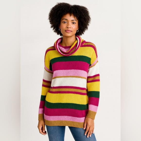 • Design Details: Bold multicolor horizontal stripes (pink, yellow, green, cream, brown), long sleeves, ribbed hem and cuffs, draped cowl neckline