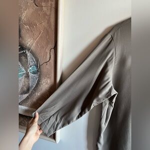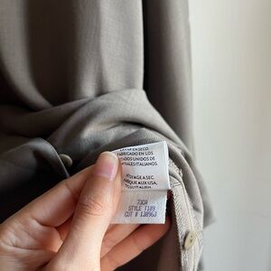 Elegant taupe blouse by Eileen Fisher. Crafted with Italian fabric.