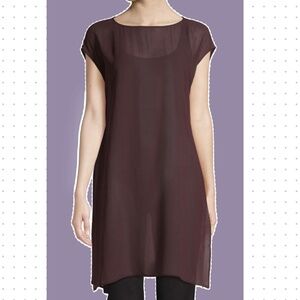 100% silk tunic in burgundy color by Eileen Fisher. Size is XS but fits oversized. Trendy sheer top, elegant and upscale.