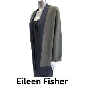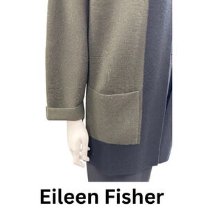 Eileen Fisher Cardigan Sweater Pockets Collarless Merino Wool Dark Green XS
