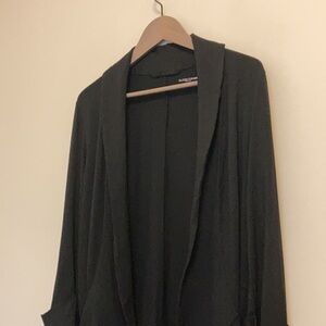 An open front style with a shawl collar, cocoon shape, cuffed sleeves and two pockets.