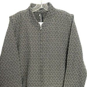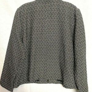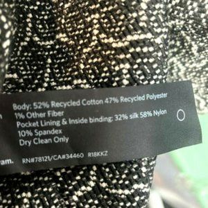 Features: long sleeve, black and white print fabric, stand up collar, front zip closure, unlined, inside pockets, 2 front pockets (still sewed shut, have not been opened yet), body of jacket is 52% recycled cotton, 47% recycled polyester, pocket lining is 32% silk, 58% nylon, 10% spandex, rn#78121 ca#34460