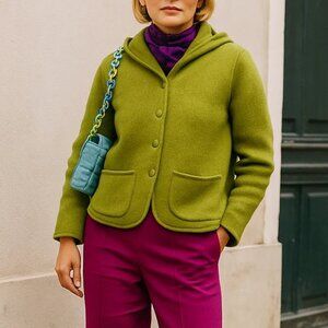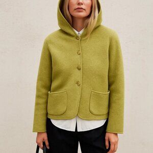 This versatile hooded cardigan coat by Eileen Fisher, crafted from a cozy lambswool and cotton blend, offers both warmth and style. With its vibrant green color and practical front pockets, it is the perfect layering piece for adding a pop of color to your everyday outfits