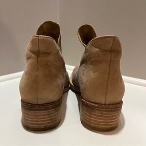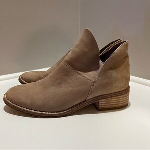 A split bootie in soft suede. A modern shoe that's easy to slip on and go.