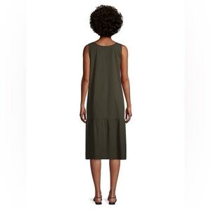 Elastane in fabric provides some stretch. Lightweight, generously airy dress with horizontal seams and shirring to create a tiered shape. Cutesy, breezy, shaped silhouette. Narrowest in the shoulders and gets wider the lower you go. Calf length. Nice puckered cotton weave if you like garments that “hold their own,” not cling. Scoop neck. Sleeveless.