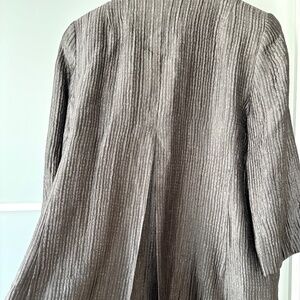 Beautiful dark grey textured jacket from Eileen Fisher. Stand up collar, open front stling with inverted back pleat to give this lmedium-length duster jacket a little swing. Gret condition - worn only once or twice. Classic Eileen. Shell is 90% silk, 10 acrylic. Liniing is 100% silk. Happy to provide measurements, so just ask.