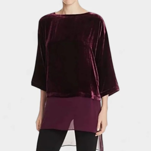 Eileen Fisher tunic with contrasting top and bottom portion. Made of silk and velvet rayon in a rich grape/ purple colour. It is soft, elegant, and flowy. Lined in silk (see last photo). Dropped shoulders, 3/4 length sleeves. The material does not have stretch, but it is an oversized fit.