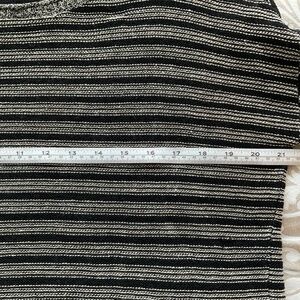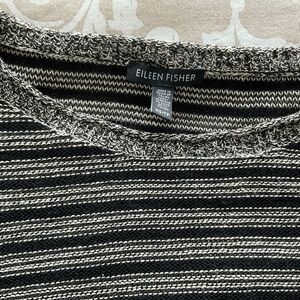 In good pre-loved condition, Eileen Fisher black and beige striped sweater. Textured linen blend fabric, loosely knitted. Boxy body and tighter sleeves. Please note two barely visible mended areas (front and side). Both are shown on the pictures and only slightly visible when worn.