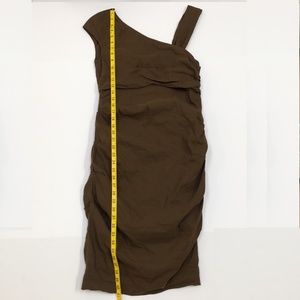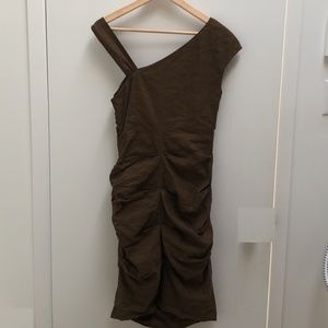 Figure flattering Eileen Fisher ruched dress. S. Olive/brown with a hint of metallic. Has some stretch so it's very comfortable.