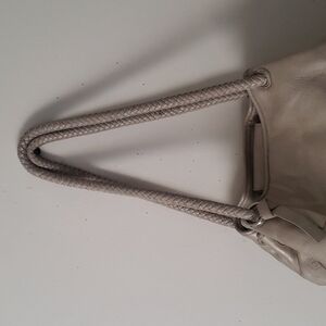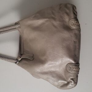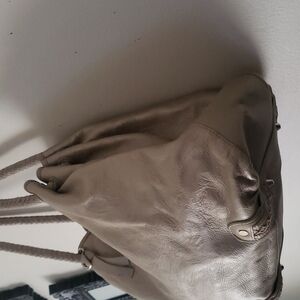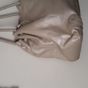 Pearlized platinum color embossed floral large leather handbag. Leather rope drawstring look with leather rope handles. Use as a shoulder bag or tote. Eileen West brand. Measures W- 15"inches H-13", with a strap drop of 10 inches. Magnetic hidden flap closure with large inside zipper compartment, zipper pocket non zipper compartments. overall preowned condition is great.
