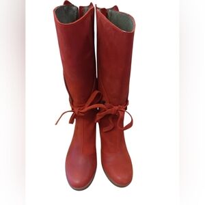 Made in Spain, these red leather boots feature a zipper closure with a leather tie.