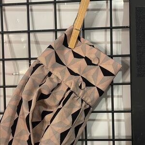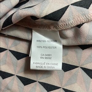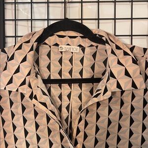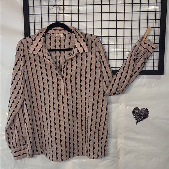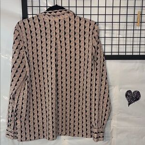 Stylish blouse with a geometric design. Features a button-up front and classic collar. See photos for measurements